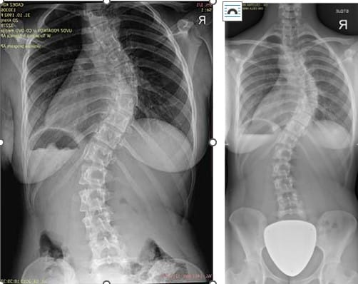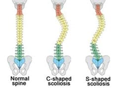 kjer govorimo o dvojni ukrivljenosti in hrbtenica pogosto zavzame S-obliko, ki je drugače značilna za hrbtenico, ko jo gledamo od strani.