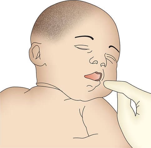 Dojenčku v usta na nebo položimo bradavico, dudo ali prst. Če se je refleks razvil bo dojenček z ustnicami objel stvar, ki smo jo dali v usta in ritmično začel stiskati jezik in nebo.