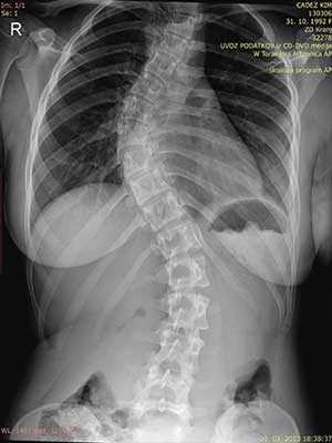 Katastrofalen izid. 56° v prsnem košu in 45° v ledvenem. Jezni pogledi ortopedov in sester, da če smo pametni, bom šla na operacijo in naj se nehamo hecati…