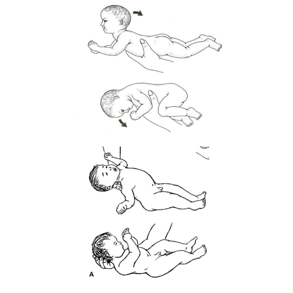 - Na hrbtu: Ko jim dvignemo glavo, bodo iztegnili noge ter odprli roke, ko pa jim glavo dvignemo bodo noge in roke dvignili k trebuhu.