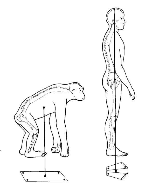 Evolucijske spremembe stopal so se začele s prehodom v pokončno držo in hojo po dveh nogah. S tem smo spremenili naše težišče, naredili naše gibanje bolj ekonomično (hoja po vseh štirih je energijsko veliko bolj potratna), omogočili rokam prosto”pot”, da smo lahko začeli izdelovati orodja , pridobili pa smo tudi nov pogled na svet iz druge perspektive. Karakteristična pokončna hoja z iztegnjenimi koleni in medenico nam je omogočila S-obliko hrbtenice, položaj lobanje nad našim centrom/težiščem telesa ter postavila center gravitacije med obemi stopali.